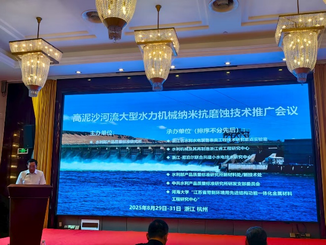 2025年8月29日- 30日,由水利部产品质量标准研究所主办的“高泥沙河流大型水力机械纳米抗磨蚀技术推广会议”在浙江杭州举行,公司“江苏省苛刻环境用先进结构功能一体化金属材料工程研究中心”与浙江省水利水电装备表面工程技术研究重点实验室等多家单位联合承办。